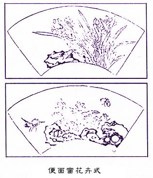 此湖舫式也。不獨(dú)西湖,凡居名勝之地,皆可用之。但便面止可觀山臨水,不能障雨蔽風(fēng),是又宜籌退步,以補(bǔ)前說之不逮。退步云何?外設(shè)推板,可開可闔,此易為之事也。但純用推板,則幽而不明;純用明窗,又與扇面之制不合,須以板內(nèi)嵌窗之法處之。其法維何?曰:即仿梅窗之制,以制窗欞。亦備其式于右。