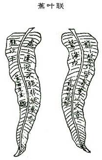 蕉葉題詩,韻事也;狀蕉葉為聯(lián),其事更韻。但可置于平坦貼服之處,壁間門上皆可用之,以之懸柱則不宜,闊大難掩故也。其法先畫蕉葉一張于紙于,授木工以板為之,一樣二扇,一正一反,即不雷同。后付漆工,令其滿灰密布,以防碎裂。漆成后,始書聯(lián)句,并畫筋紋。蕉色宜綠,筋色宜黑,字則宜填石黃,始覺陸離可愛,他色皆不稱也。用石黃乳金更妙,全用金字則太俗矣。此匾懸之粉壁,其色更顯,可稱“雪里芭蕉”。