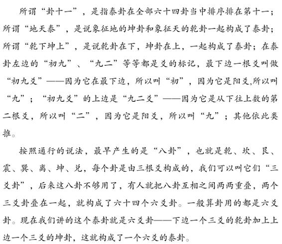 這個(gè)卦是六十四卦系統(tǒng)中的泰卦。泰卦是由八卦系統(tǒng)中的乾卦和坤卦組合成的,乾在下,坤在上。歷來對泰卦的經(jīng)典解釋是:乾象征天,坤象征地;乾在下意味著天往下跑,坤在上意味著地往上躥,于是乎天地相交,大吉大利。