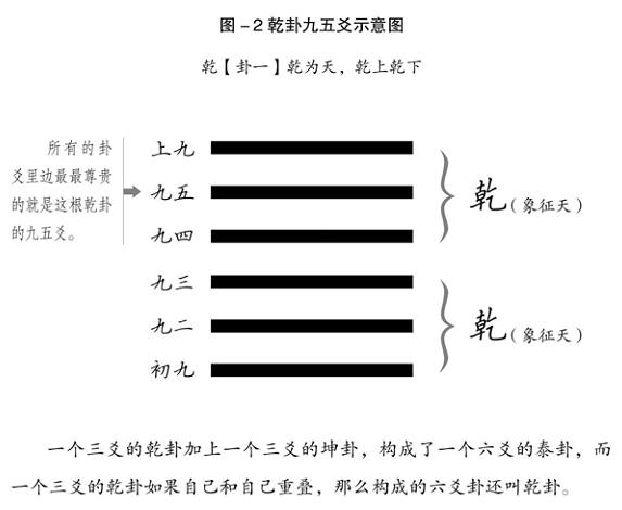 先簡單介紹一下什么叫“九五爻”。在六十四卦的系統(tǒng)里,一個(gè)卦是由從下到上的六根線條組成的,這些線條叫做“爻”;“九五”的“五”就是指從下往上數(shù)的第五根線條;“九”在這里卻并不代表數(shù)字,而是代表這一爻的屬性是“陽”。所以,所謂“乾卦的九五爻”就是指乾卦的第五根線條,它的屬性是陽性。