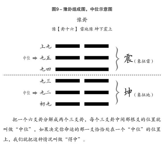 先看豫卦下半身的這個坤卦:三爻當中的那一爻的位置叫做“中位”,上半身的那個震卦也是同樣道理,中間那一爻的位置叫做“中位”。如果你占到的爻恰好落在一卦的“中位”上,這就叫“得中”,是個吉兆。如果這一爻既“得位”又“得中”,那就屬于吉上加吉了。