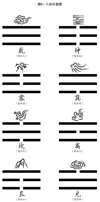 一個卦雖然有六個爻,其實分析起來,這種六個爻的卦都是由三個爻的卦兩兩組合而成的。三個爻的卦就是我們都很熟悉的所謂“八卦”: