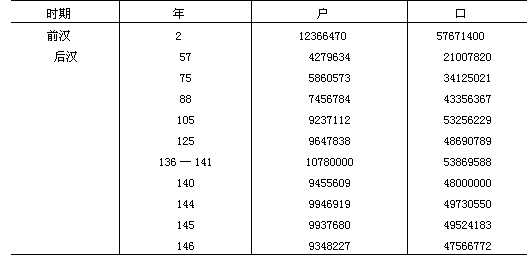 [11] 上表的公元2年和140年的人口數(shù)字的材料,分別見(jiàn)于《漢書》卷二八下,第1640頁(yè)和《后漢書·志》卷二三,第3533頁(yè)。其他年的數(shù)字,取自《后漢書·志》卷二三,第3534頁(yè)的注釋。這些數(shù)字依據(jù)不同的資料,它們不一定都有詳細(xì)說(shuō)明。公元2年和140年的數(shù)字根據(jù)畢漢斯的《人口統(tǒng)計(jì)》第58—59頁(yè)的材料進(jìn)行了更正。