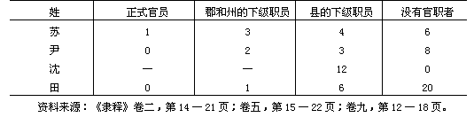 民用銘文很少詳細說明人們之間的親屬關系,但是,往往有那么多同姓人,以致能夠合理地推斷出某種親屬關系。例如,在作為對一位被調職縣令表示敬意于公元186年建立的碑刻發(fā)起人而列舉的41人中,有26人姓韋,12人姓范。[34] 這樣的縣級工程發(fā)起人名單總共有11份,而且除了其中兩份外,至少有一個家族的姓經(jīng)常出現(xiàn);在其中四份中,有一個家族的姓占這些名單中的姓的20%以上。在有100多個姓的三份名單中,每份名單都證明幾家名門以及同一姓的官員、下級官員和非官員同住一地。例如,為對一位縣令表示敬意而于公元185年建立的一塊碑刻的157名發(fā)起人中,24人姓李,14人姓蘇,13人姓尹。[35] 表18的數(shù)字表明四個地方親屬集團中存在著官員、下級官吏和沒有官職的人。[36]