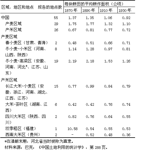 如表二所示,中央農(nóng)業(yè)實驗所調(diào)查的答復者報告說,他們所在的幾個地方的農(nóng)田面積與所發(fā)生的緩慢而持續(xù)不斷的人口增長相比,并沒有增加的跡象。隨之產(chǎn)生的人-地比例狀況的日趨不利可以從表三所表示的農(nóng)田平均面積的歷史性資料中反映出來(這些材料是巴克的實地調(diào)查員為他的有歷史價值的土地利用研究工作收集的)。絕大部分巴克的答復者把報告中耕田平均面積的縮小歸因于他們所在地區(qū)人口的增加。在華北(巴克調(diào)查的冬小麥-高粱產(chǎn)區(qū)),農(nóng)田平均面積的縮小比華中(大米-小麥和大米-茶葉產(chǎn)區(qū))更為明顯。這個差別可以歸因于長江以南各省因太平軍叛亂而造成的嚴重得多的人口損失,和隨之產(chǎn)生的華中和華南人-地比例的暫時下降。隨著從人口比較稠密的地區(qū)向這些當時人口相對地說比較少的省分移民,后者的人-地比例又向上升,于是在1900年以后,耕田的平均面積慢慢地縮小了。