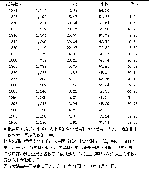 表四 1821—1910年期間九省上報豐收、平收和歉收
