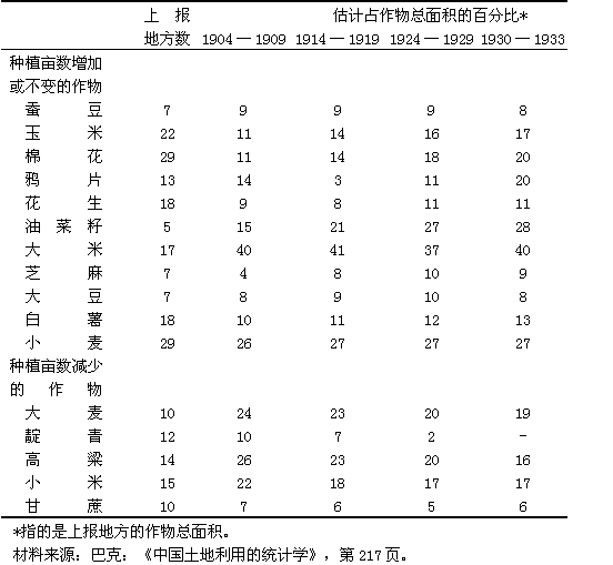 表五 1904—1909年和1930—1933年期間作物種植畝數(shù)變動趨向