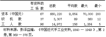 雖然織布業(yè)主要仍是個體戶手工業(yè),但在剛進(jìn)入本世紀(jì)之際,工業(yè)組織的其他形式已在有些地方出現(xiàn)。由于有了較便宜的機(jī)制紗的供應(yīng),有了能提高織布者日產(chǎn)量的改進(jìn)的木質(zhì)織布機(jī)和從日本引進(jìn)的鐵齒輪織布機(jī),這些變化加快了。有一份計(jì)算材料記載,在1899—1913年期間共創(chuàng)辦了142家手工紡織工場,其中69家設(shè)在江蘇省,以上海制的棉紗供應(yīng)它們,15家設(shè)在山東,14家設(shè)在直隸(河北),9家設(shè)在四川,山西、福建和廣東各設(shè)7家,6家設(shè)在湖北,4家設(shè)在滿洲,3家設(shè)在浙江,1家設(shè)在貴州。表八說明了這些工場的規(guī)模和設(shè)備。
