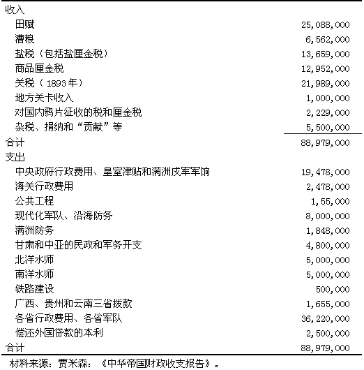 表二十一 十九世紀(jì)九十年代初期中央政府年收支的估算數(shù)(庫(kù)平銀)