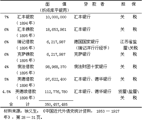 在1894至1911年期間,清政府向外國(guó)人簽訂的貸款達(dá)746,220,453兩庫(kù)平銀。其中330,587,160兩貸款用作興建鐵路之用,以后用鐵路本身的收入償還。雖然有幾項(xiàng)借約給予承受抵押的外國(guó)人以實(shí)際經(jīng)營(yíng)特權(quán)和采購(gòu)材料時(shí)的豐厚傭金,但鐵路貸款本利的償付并不意味著給中央政府的正常收支直接增加負(fù)擔(dān)。為工業(yè)目的而借的借款都比較少,共25,517,349兩,其中為架設(shè)電報(bào)線(xiàn)和購(gòu)置設(shè)備而借入的資金為5,452,783兩,雜項(xiàng)用途的借款為647,812兩。工業(yè)借款主要包括日本債主借給半官辦的漢冶萍公司的貸款。漢冶萍公司無(wú)力償還這筆債款,債務(wù)越陷越深,于是就給日本提供了借口,把正式承認(rèn)日本控制該公司的內(nèi)容列入1915年的“二十一條”要求之中。