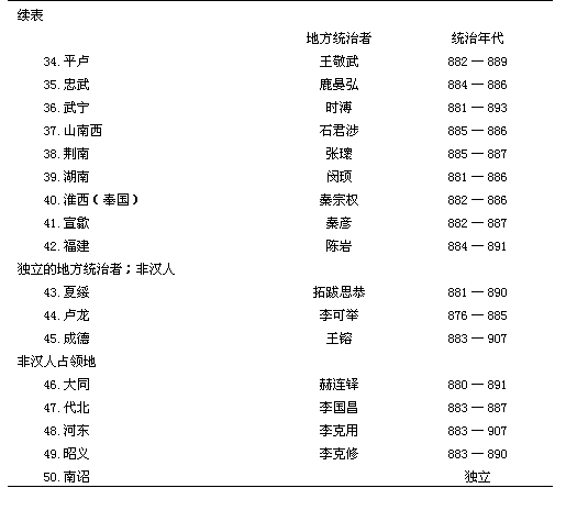 中國(guó)其他地方的政治和軍事局勢(shì)在繼續(xù)不斷地變動(dòng)。對(duì)于這些地區(qū)來(lái)說(shuō),皇帝的回鑾并沒(méi)有多大意義。這些年藩鎮(zhèn)的不穩(wěn)定程度,從885年掌權(quán)的節(jié)度使在890年已有半數(shù)以上被取代這一事實(shí)明顯地表現(xiàn)出來(lái)(見(jiàn)地圖22和附表)。在下面我們將討論在各地的最重要的發(fā)展。