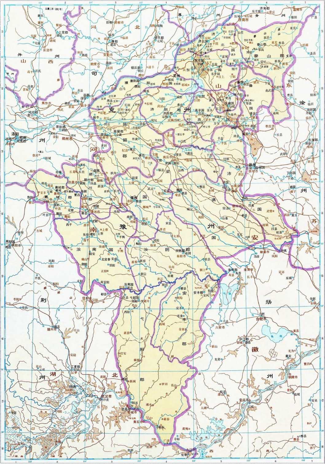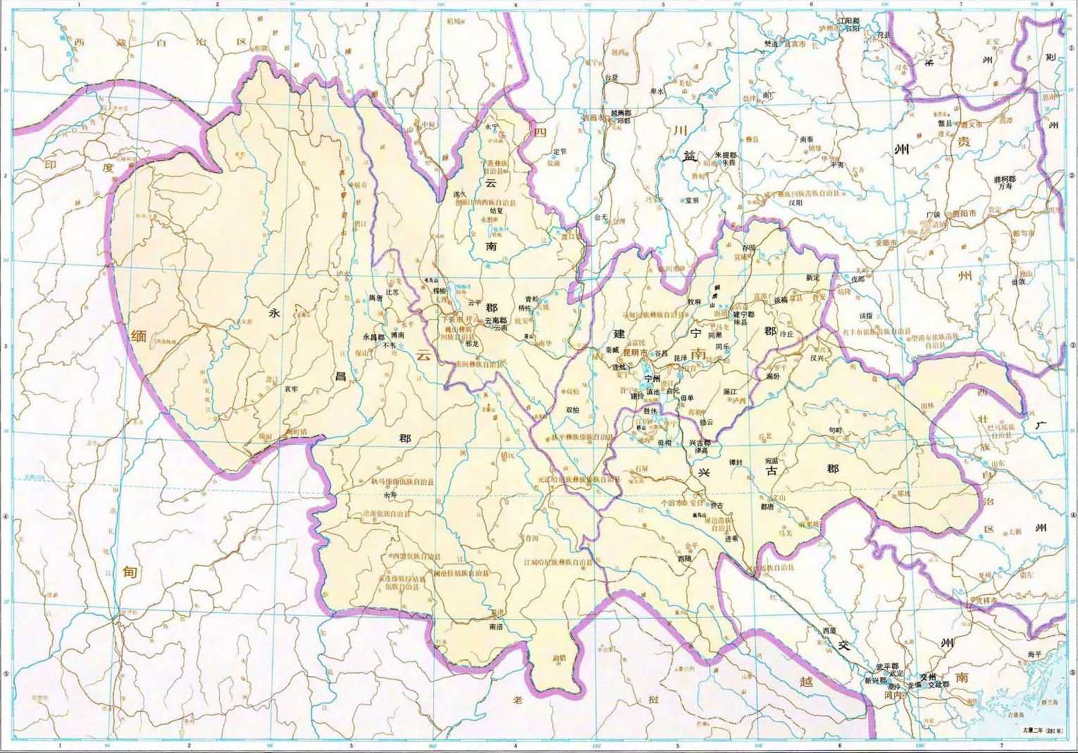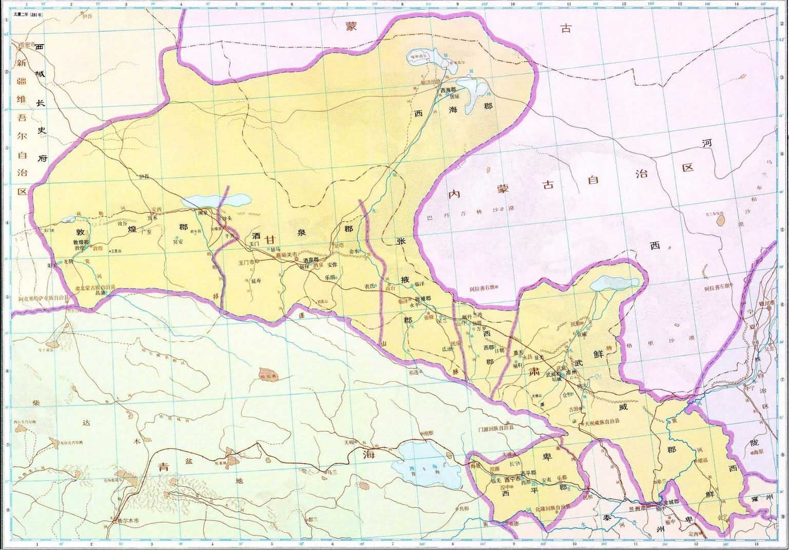 二、全圖畫出晉太康二年(公元281年)的疆域政區(qū)和當(dāng)時(shí)我國邊區(qū)各族分布地。晉境內(nèi)畫出十九州和西域長史府的轄境和治所、部分郡國治所和西域?qū)賴赘_厖^(qū)各族因記載簡略,只標(biāo)注其大致方位,并鉤出若干條部族的活動范圍界。