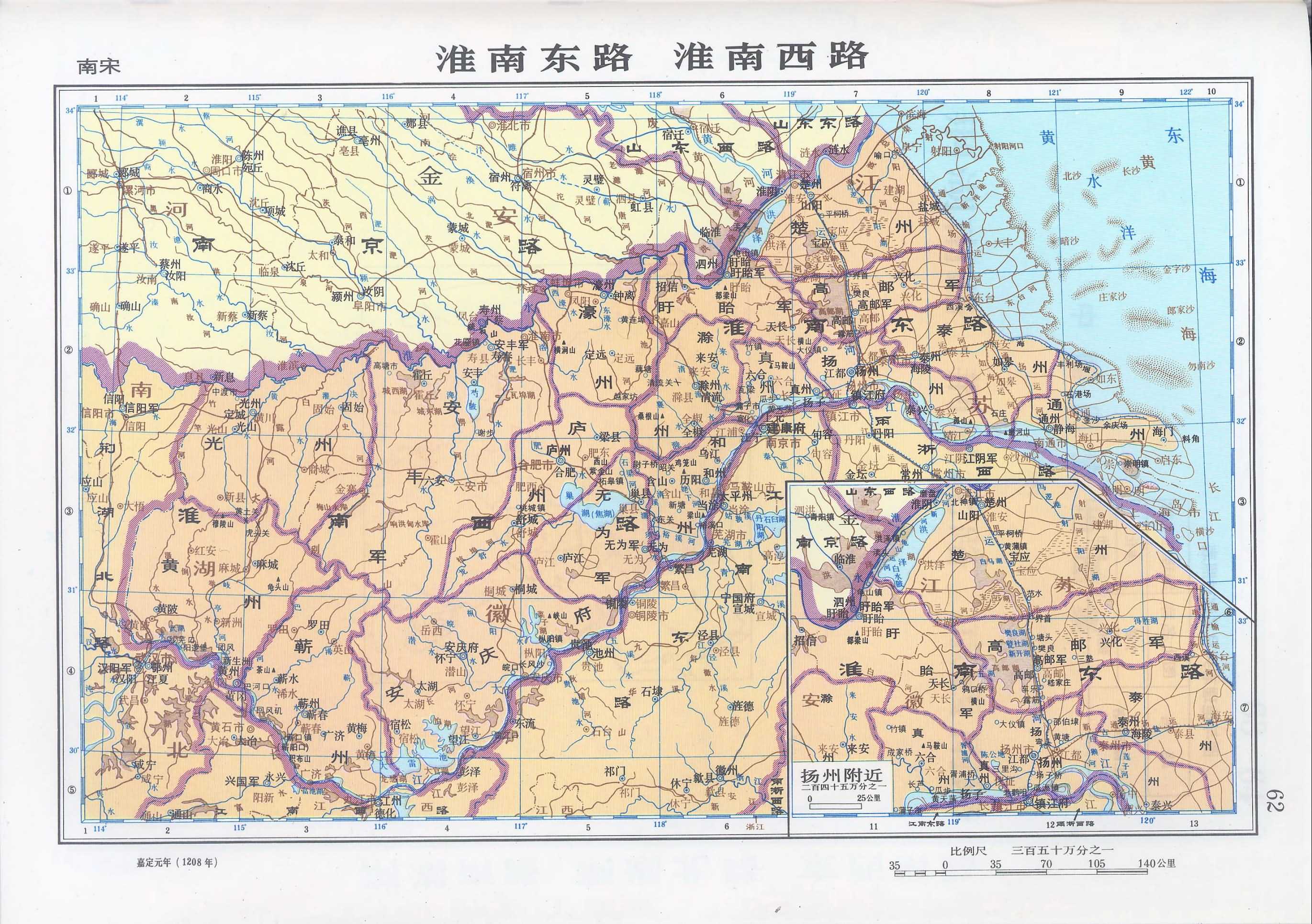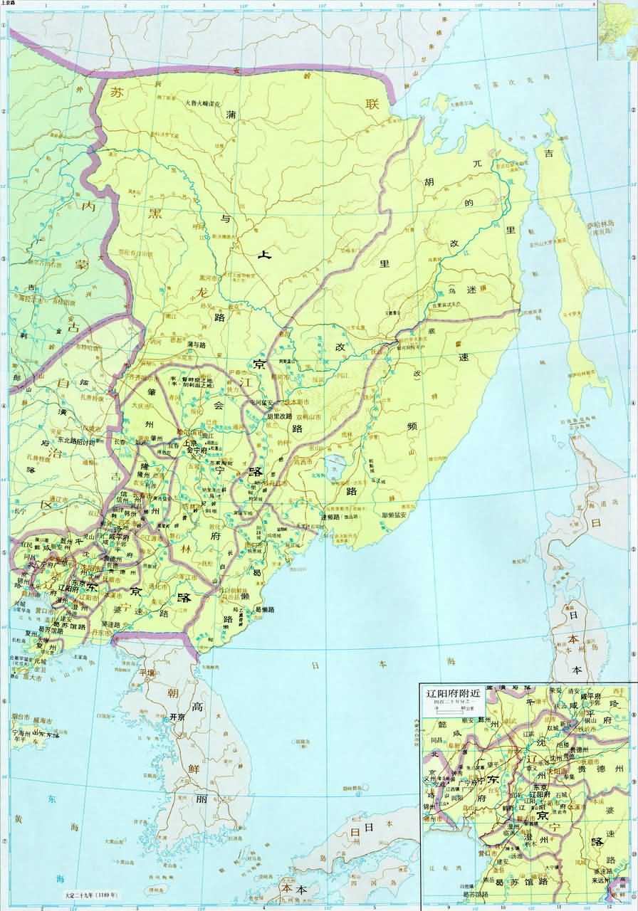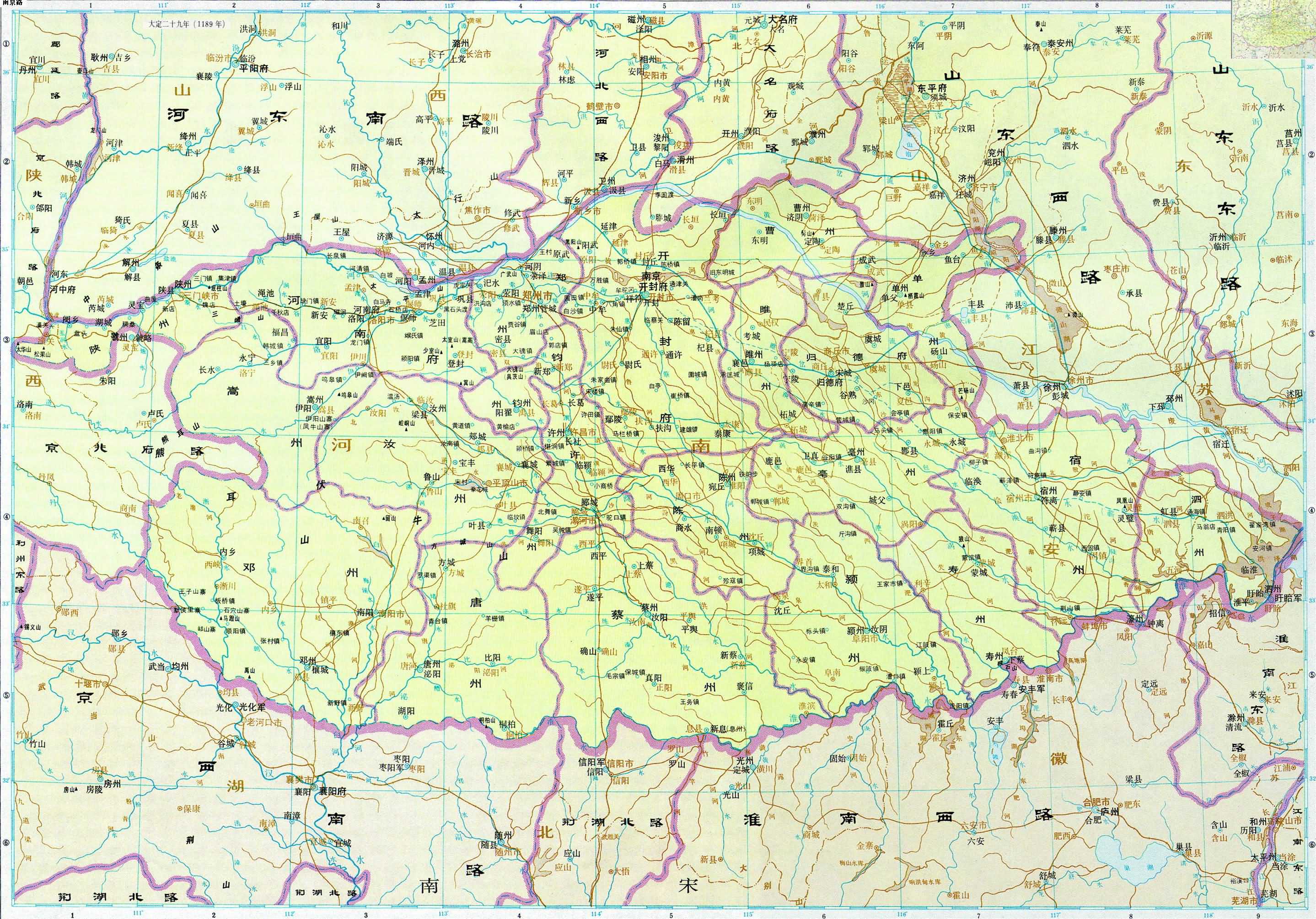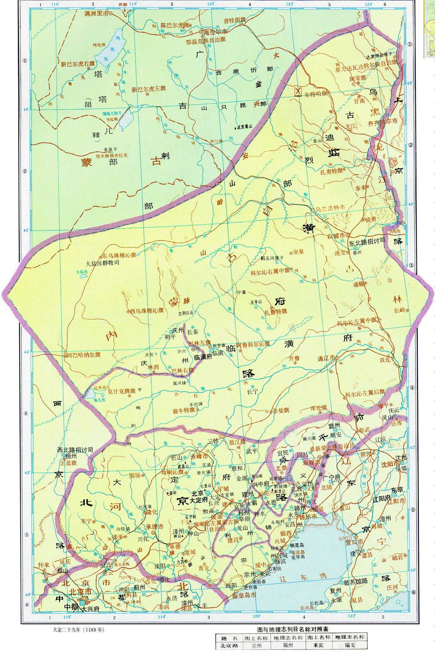 三、分幅圖金八幅,以大定二十九年(1189年)建制為準(zhǔn);宋八幅,以嘉定元年(1208年)建制為準(zhǔn);各按其時(shí)的路制分幅。畫出路和府、州、軍、監(jiān)的轄境和治所,縣的治所和城鎮(zhèn)堡寨關(guān)等設(shè)治地點(diǎn)、邊境部族和羈縻州、部。金東京路、宋淮南東路、廣南西路各附插圖一幅。