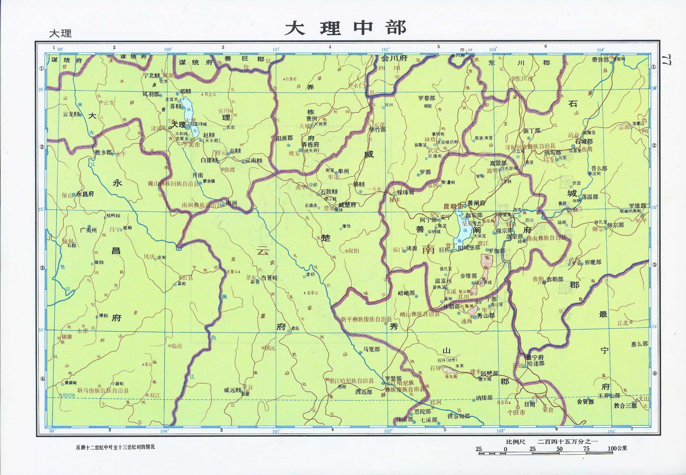 大理全境一幅,中部擴(kuò)大圖一幅,按十二世紀(jì)中葉至十三世紀(jì)的情況編繪。全境分為十五個(gè)府、郡級(jí)政區(qū),畫出其轄境、治所,用府州級(jí)符號(hào)注記;下轄 州、賧、部、郡等比較重要的城邑用縣級(jí)符號(hào)注記,其余居民點(diǎn)用聚邑符號(hào)注記。