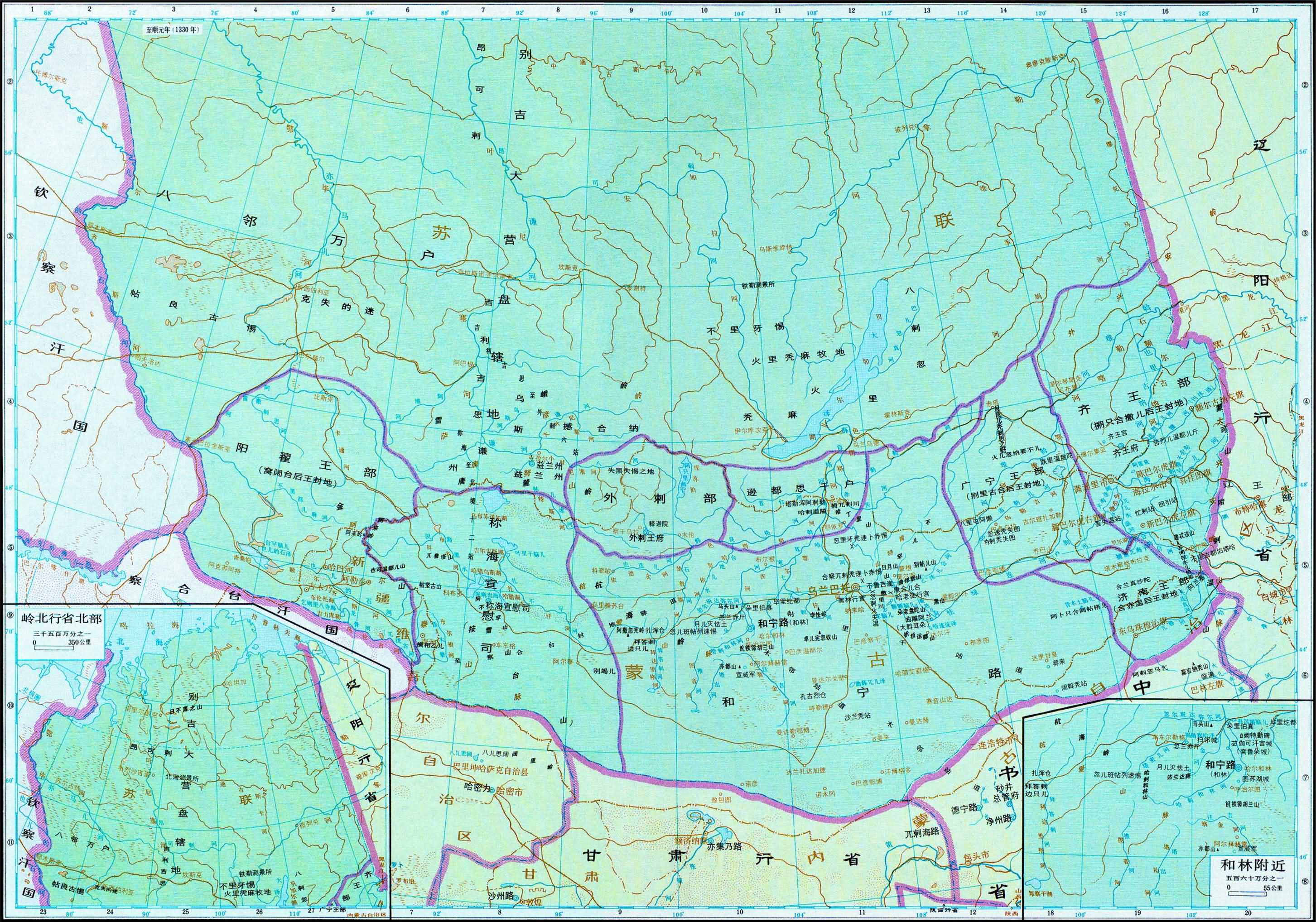 十、 嶺北諸藩雖非行省直接管轄,與州縣有別,但仍受行省控制,故一并作嶺北行省轄區(qū)。諸藩境界大致可畫出的,用路級界線表示。