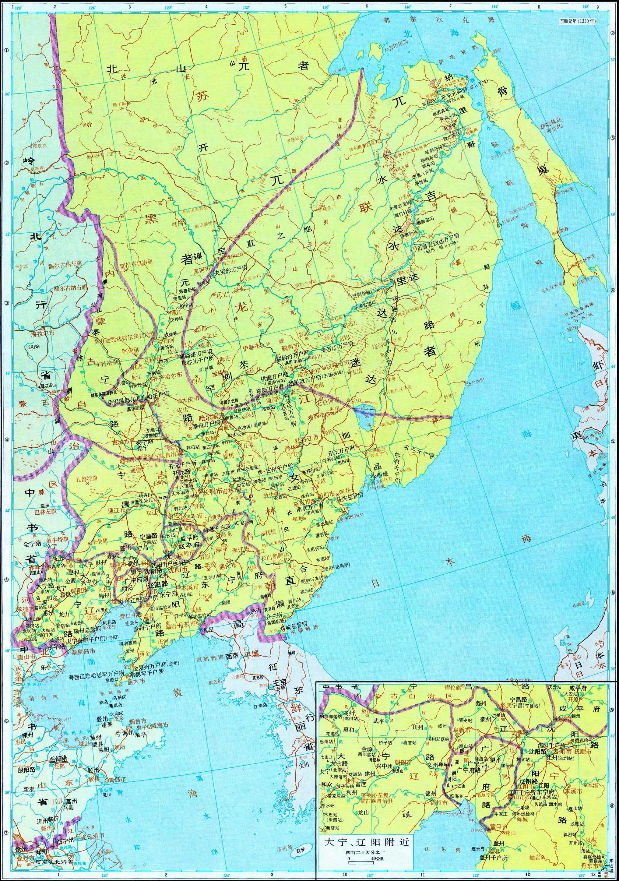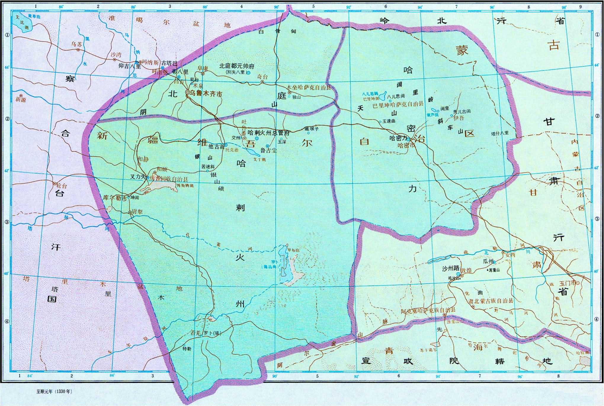 后期全圖以1330年(至順元年)為準(zhǔn),畫出中書省和嶺北、遼陽、河南江北、陜西、四川、甘肅、云南、江浙、江西、湖廣十行中書省的治所、省界、部分路府州以及西南少數(shù)民族地區(qū)的宣撫、安撫等司,和甘肅行省以西的哈密力、別失八里、哈剌火州三區(qū),吐蕃地區(qū)由總制院改稱的宣政院及其所轄三個(gè)宣慰司的大致范圍。窩闊臺汗國已不復(fù)存在;察合臺汗國分裂為東、西二部,界域不明,故僅標(biāo)“東部”、“西部”于相應(yīng)地區(qū),不畫界線。二部首府用同一符號表示。其時(shí)又設(shè)征東行省于高麗國,行省最高長官“丞相”即由高麗國王兼任,
