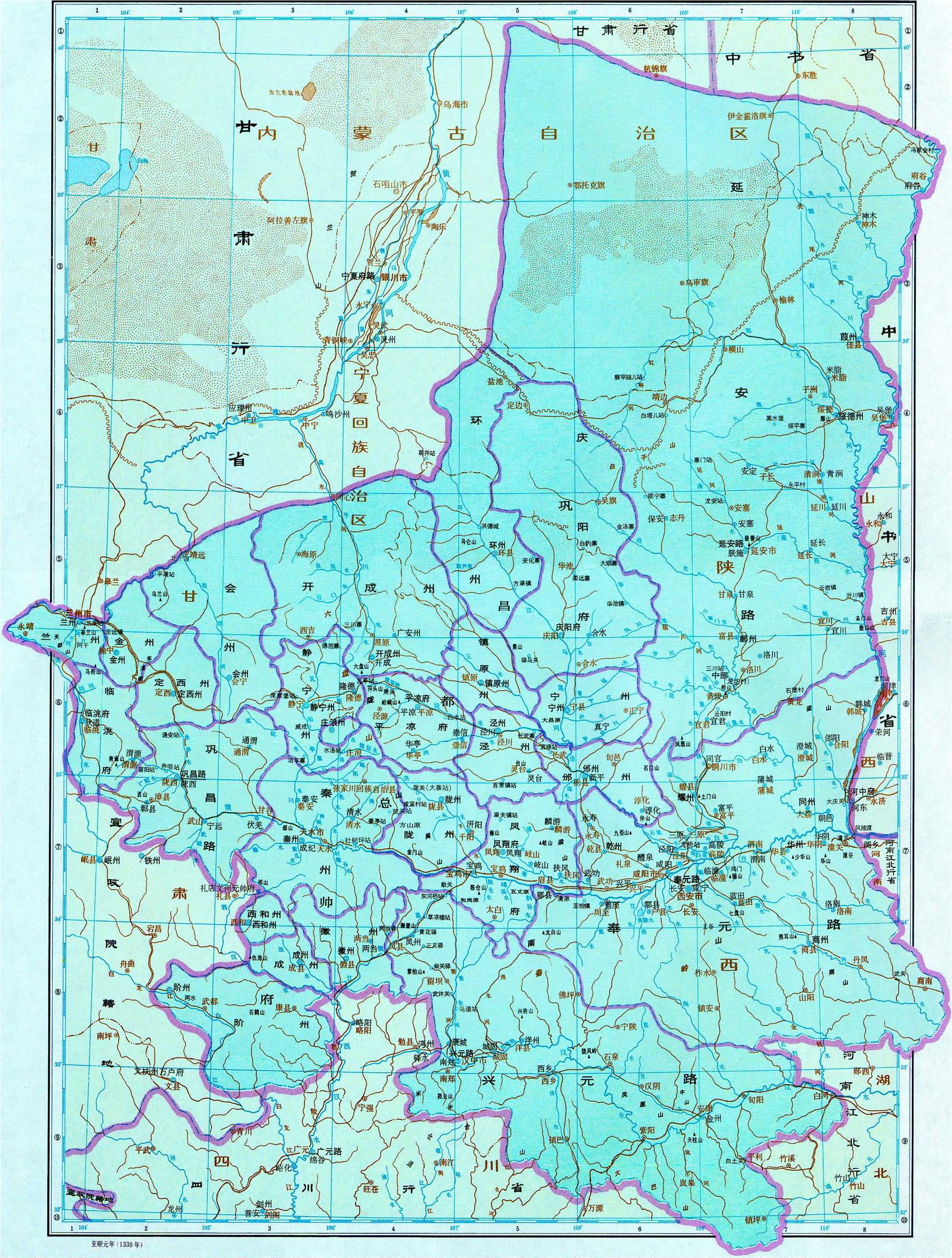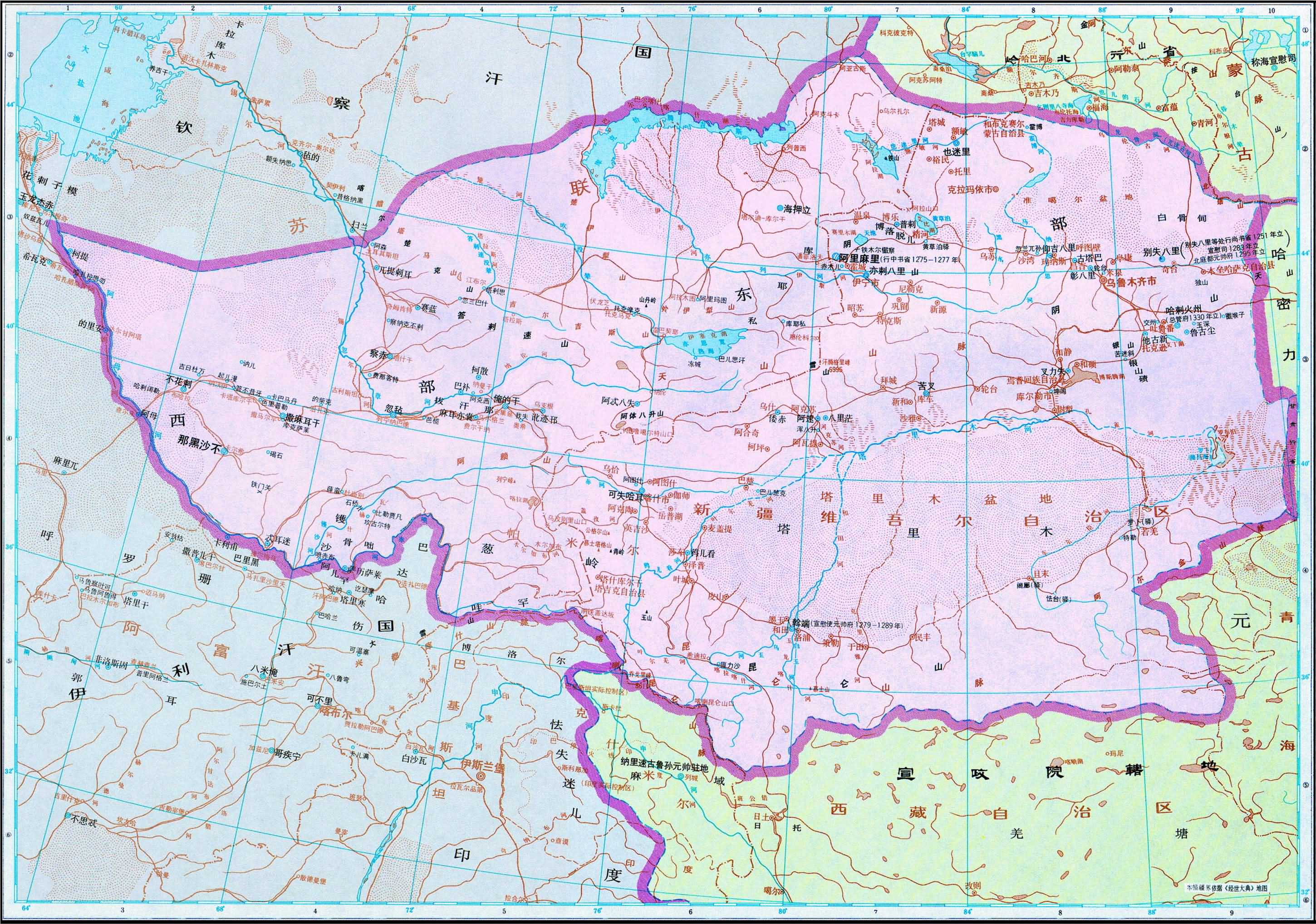 前期全圖以1280年(至元十七年)為準(zhǔn),畫出中書省和陜西四川、云南、江淮、福建、江西、湖廣六行中書省的治所、省界,部分直隸于省的路府州,以及西南少數(shù)民族地區(qū)的部分土司。其時(shí)西南地區(qū)有一些洞寨尚未歸附,因圖上無法鉤勒其范圍,概作省界內(nèi)處理。有些地方當(dāng)時(shí)建置不明,圖中只標(biāo)地名,不標(biāo)路府州縣。東北標(biāo)出成吉思汗諸弟封地大致范圍。吐蕃地區(qū)領(lǐng)以撟苤圃簲,下設(shè)宣慰司、元帥府、招討司等,具體建置罕見記載,圖從從闕。西北窩闊臺汗國與察合臺汗國聯(lián)兵抗元,二汗轄境難以分清,且察合臺汗篤哇實(shí)受制于窩闊臺汗海都,故作一區(qū)處理,標(biāo)出二汗國大致范圍;窩闊臺汗的注記字體略大于察合臺汗,籍以表示前者為主宰,后者為從屬。二汗常同駐的塔剌思,以首府符號表示。