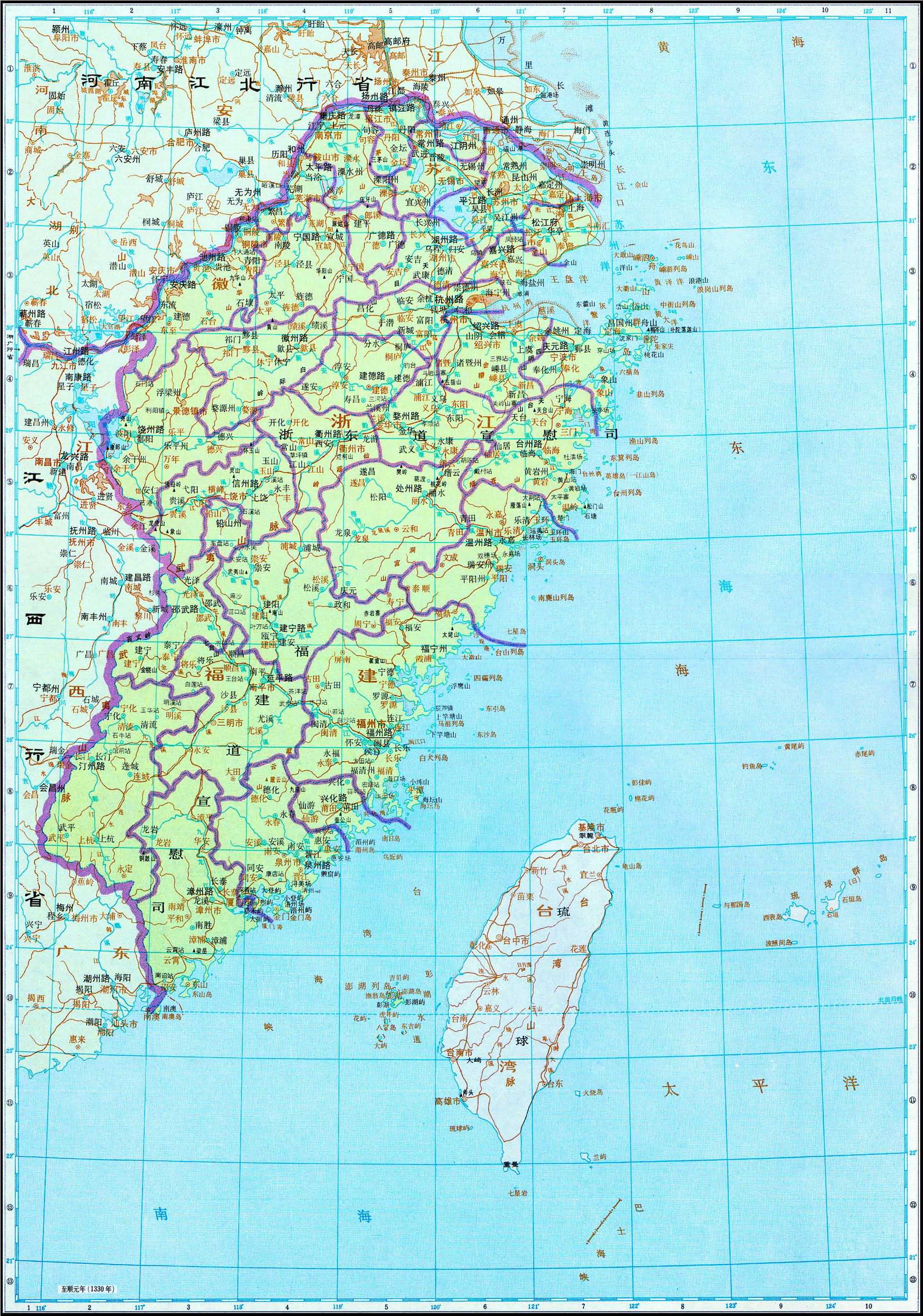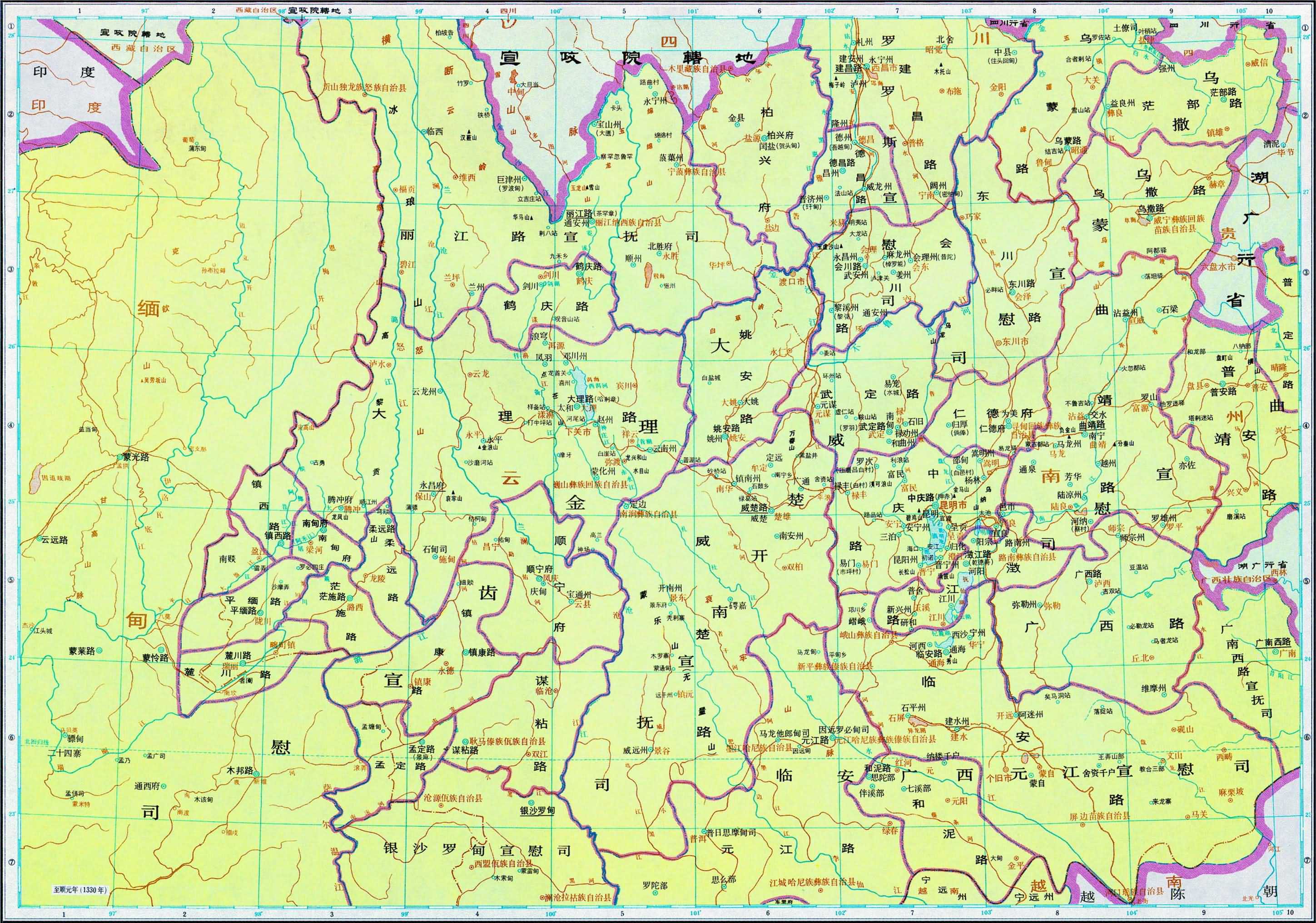 七、 元制在離省會較遠(yuǎn)的地區(qū)設(shè)有若干作為省的派出機(jī)構(gòu)的宣慰司,一司轄一道,至順時(shí)共有十一道:中書省二,河南江北行省二,四川行省一,江浙行省二,江西行省一,湖廣行省三。各司除在圖中作表面注記于適當(dāng)位置外,并標(biāo)出其治所,所轄路府州軍司則在圖背表列。