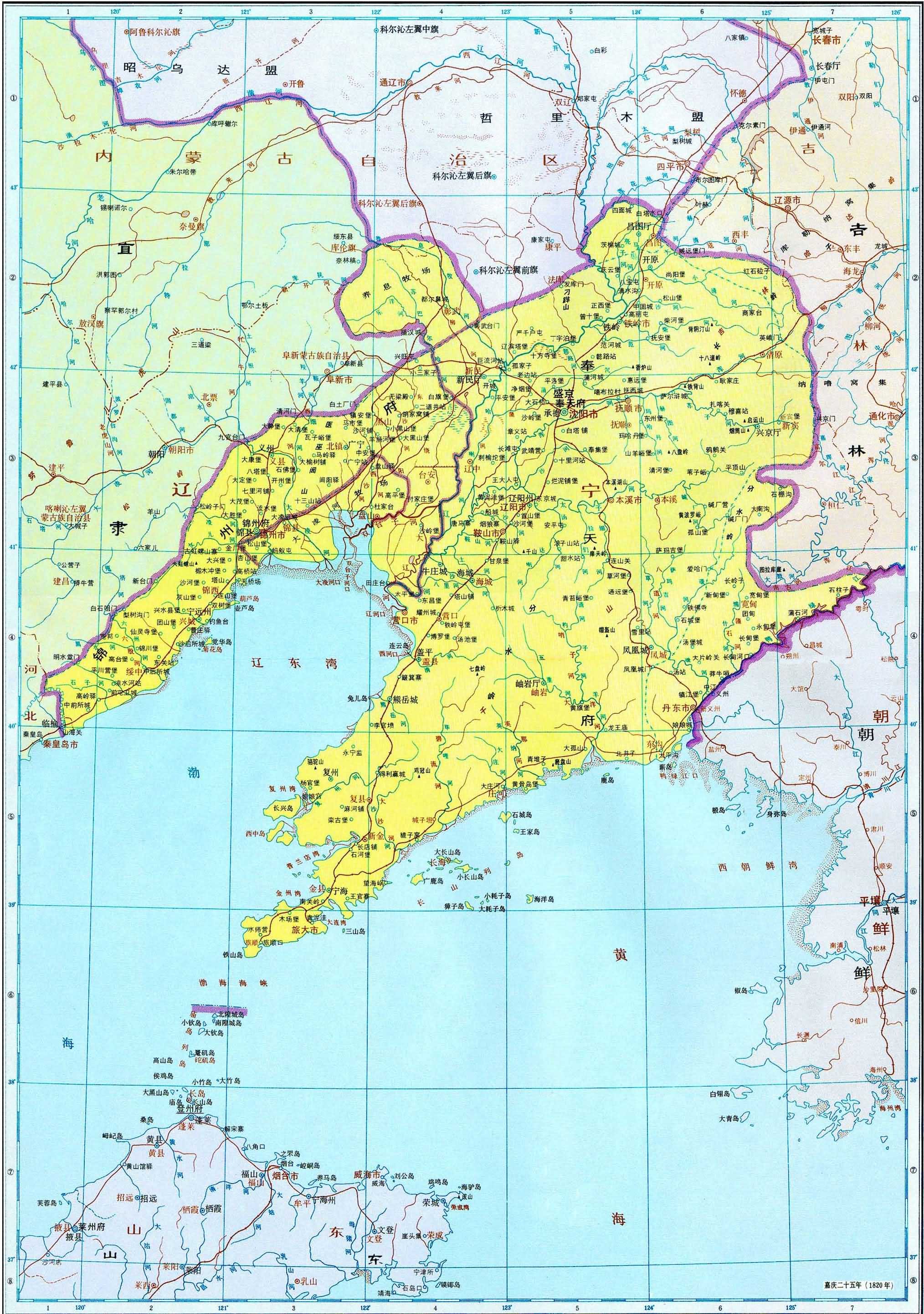 二、全圖畫出清嘉慶二十五年(1820年),光緒三十四年(1908年)的疆域政區(qū)。