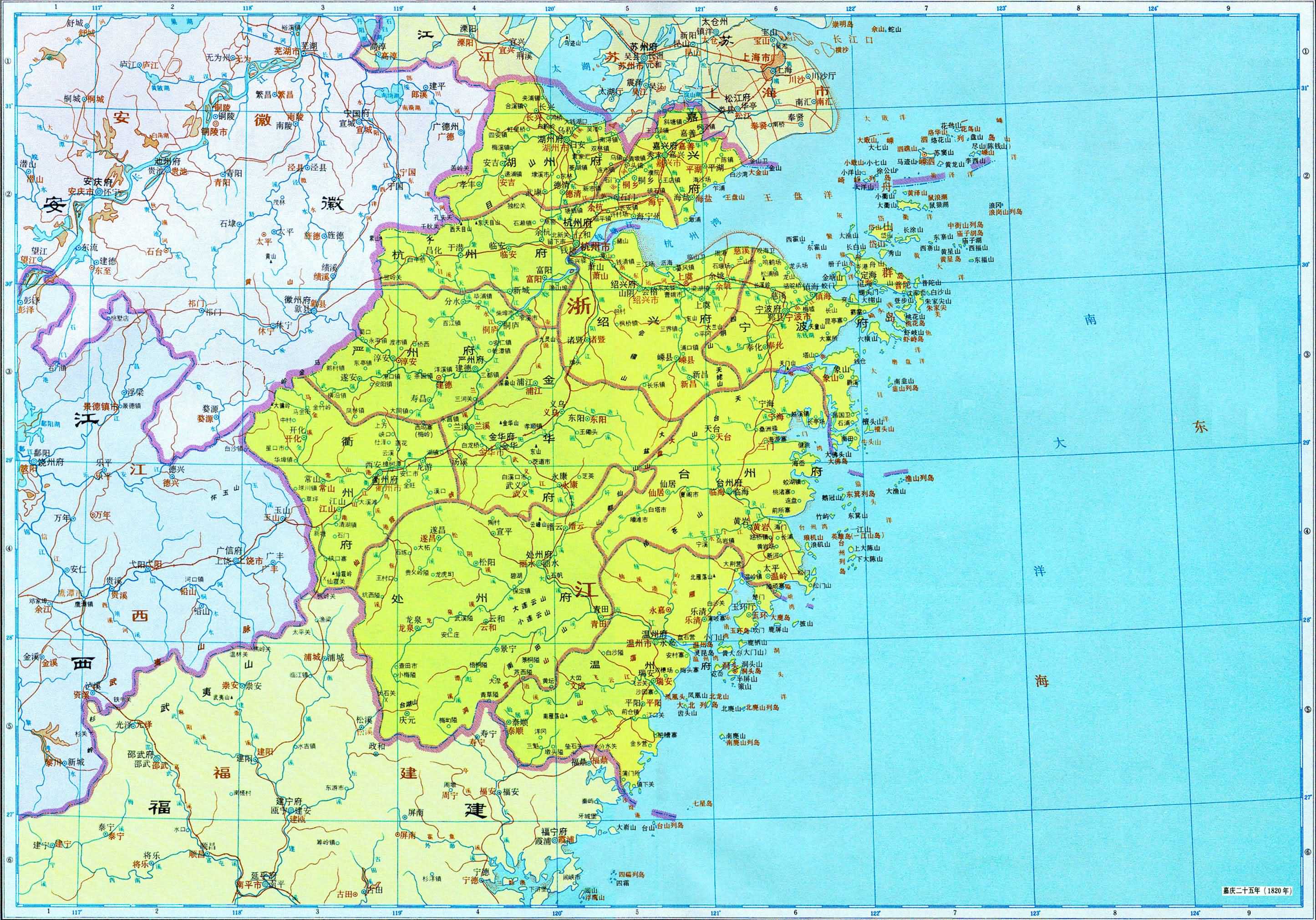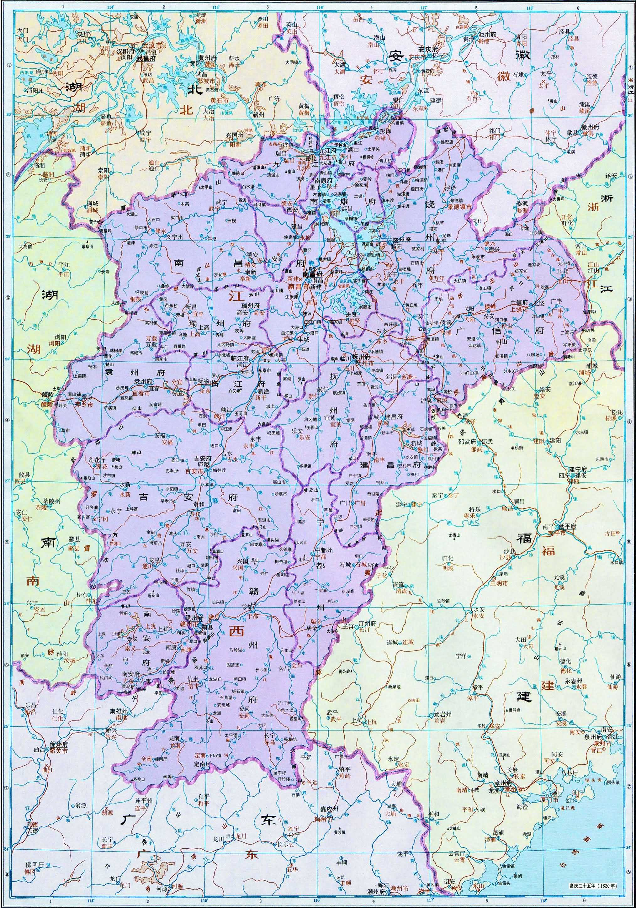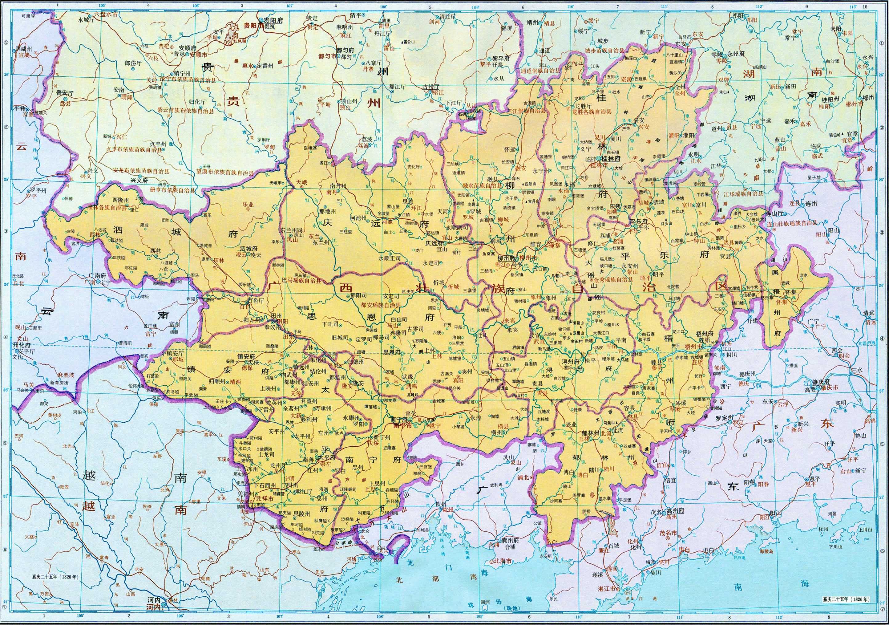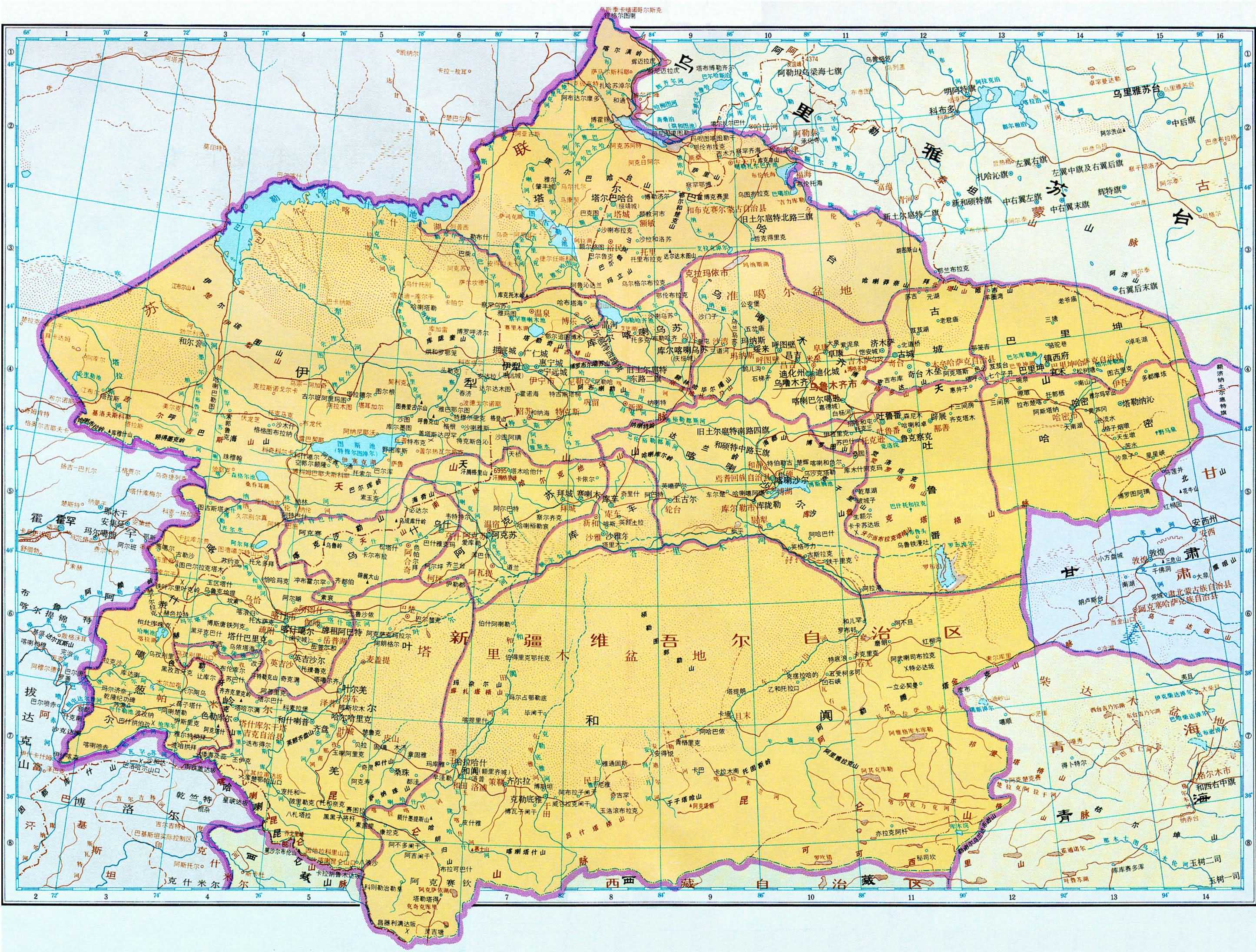 三、嘉慶全圖畫出直隸、江蘇、安徽、山西、山東、河南、陜西、甘肅、浙江、江西、湖北、湖南、四川、福建、廣東、廣西、云南、貴州十八省區(qū)及其總督、巡撫駐所與所屬部分府廳州;盛京、吉林、黑龍江三將軍的轄區(qū)、駐所及其所轄府治與副都統(tǒng)、總管駐地;標名新疆的伊犁將軍轄區(qū)、駐所及其所屬參贊大臣、辦事大臣、領(lǐng)隊大臣駐地;烏里雅蘇臺定邊左副將軍轄區(qū)、駐所及期所屬喀爾喀四部和各部本旗,科布多參贊大臣轄區(qū)和駐所,唐努烏梁海,庫倫辦事大臣和恰克圖司員駐地;西藏辦事大臣及****喇嘛的轄區(qū)、駐所,幫辦大臣及班禪額爾德尼的駐所,衛(wèi)、藏、喀木、阿里四區(qū);西寧辦事大臣轄區(qū)標名青海,境區(qū)標注青海厄魯特、玉樹四十族;內(nèi)蒙古六盟部分旗、歸化城土默特、察哈爾盟旗部分地區(qū),南與直隸、山西府廳州壤地交錯,不畫界線;套西二旗自成一區(qū),畫出界線。