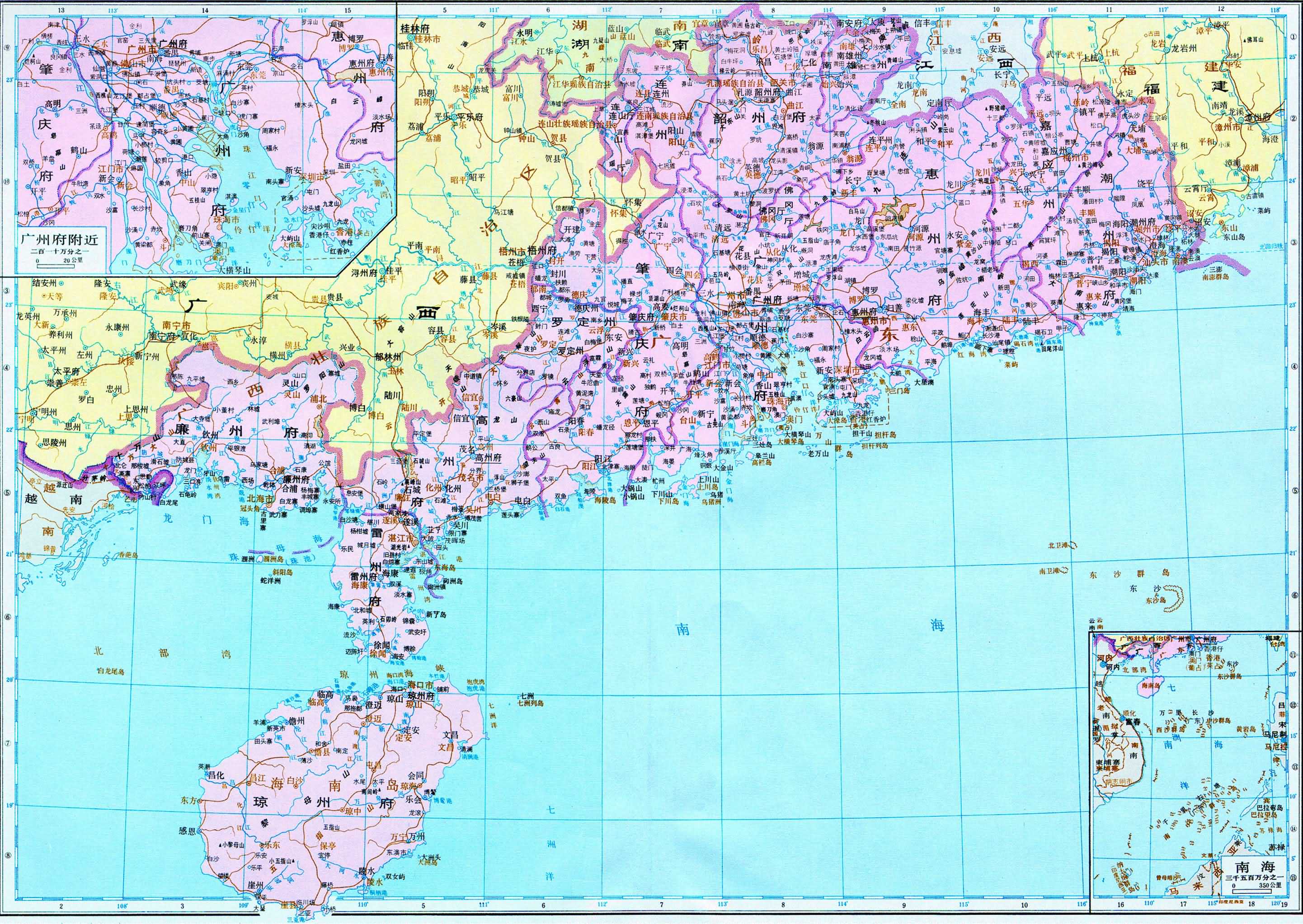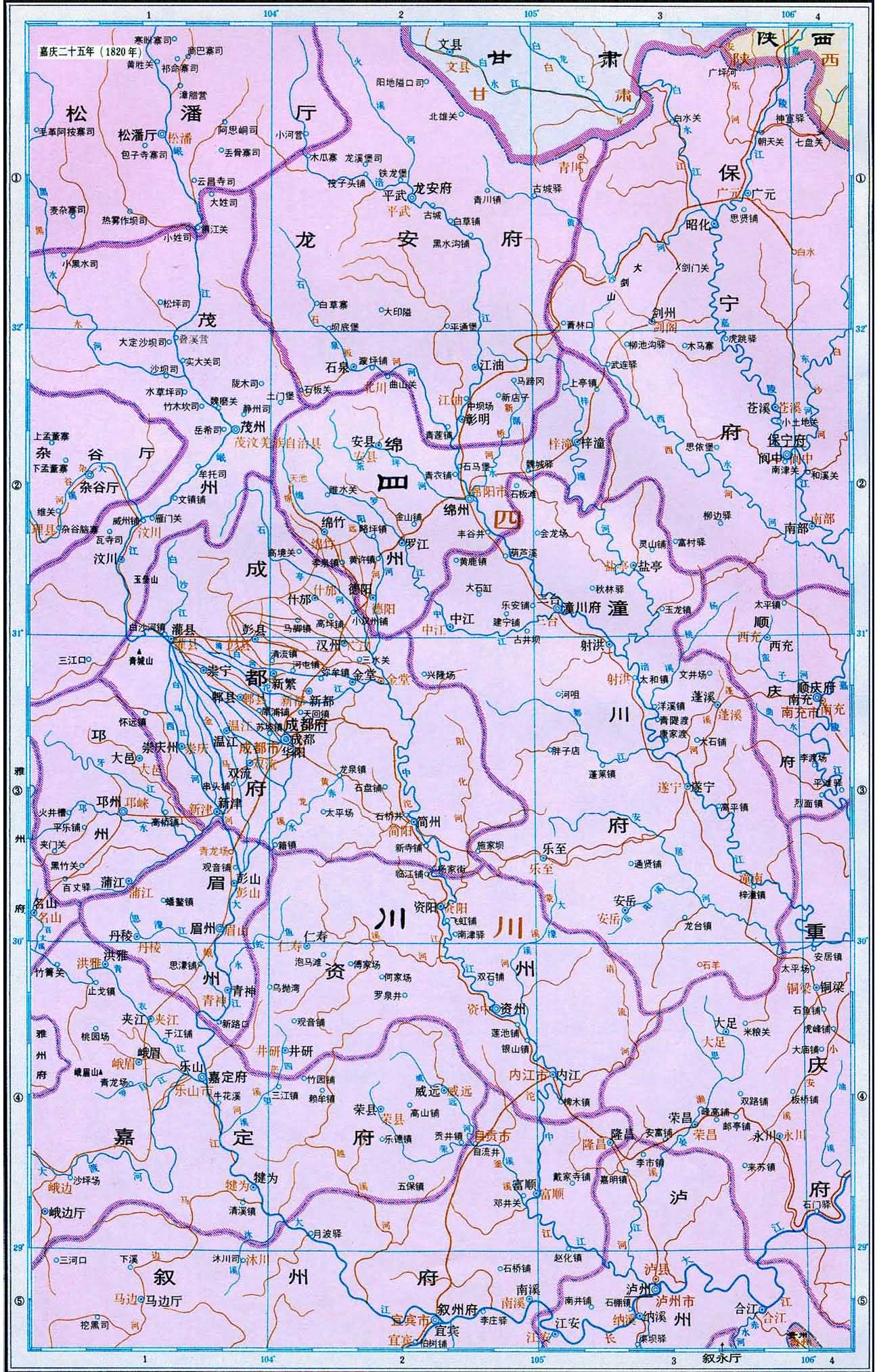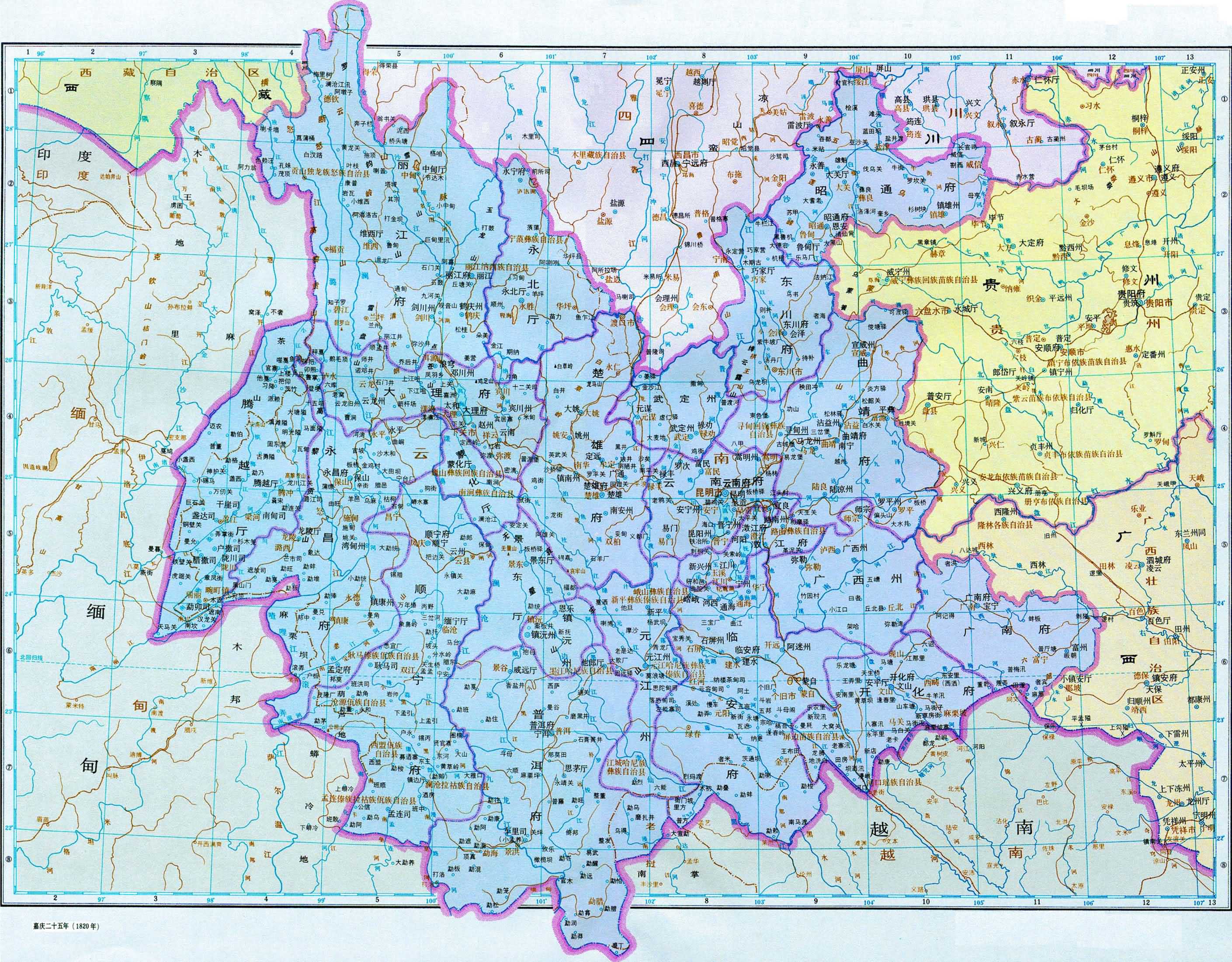 七、十八省區(qū)的府和直隸廳、州,均作府級政區(qū),畫出治所和界線,府屬的廳、州和縣,均作縣級政區(qū)。甘肅、四川、廣西、云南、貴州等省少數(shù)民族聚居地區(qū),設(shè)有文武各級土司,分別作縣級或聚邑級處理。