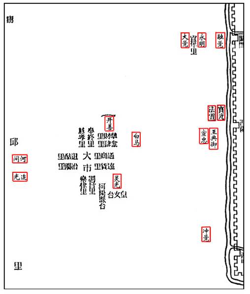 出西陽(yáng)門外四里,御道南有洛陽(yáng)大市,周回八里。市南有皇女臺(tái),漢大將軍梁冀所造,猶高五丈馀。景明中,比丘道恒立靈仙寺於其上。臺(tái)西有河陽(yáng)縣臺(tái),東有侍中侯剛宅。市西北有土山魚池,亦冀之所造,即漢書所謂:"采土筑山,十里九阪,以象二崤"者。
