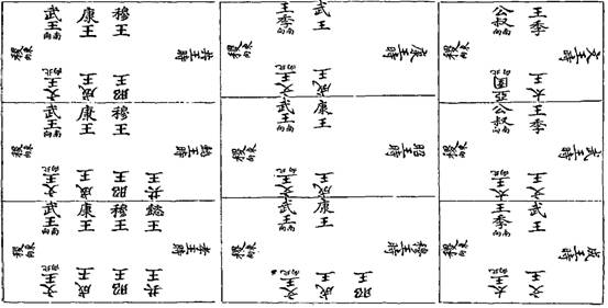 朱子曰:"昭穆之不為尊卑說己見前。其大祫,則始封以下以次相承,亦無差舛。故張儘以為四時(shí)常祀各於其廟,不偶坐而相臨,故武王進(jìn)居王季之位而不嫌尊於文。王及合食乎祖,則王季、文王更為昭穆,不可謂無尊卑之序者是也。但四時(shí)之祫,不兼毀廟之主,則右無昭而穆獨(dú)為尊。若兩世室之主,則文常為穆,而武常為昭也。故陸佃以為毀廟之主有不皆祫之時(shí)難之,而未見儘之所以對(duì)也。予竊以為以上世之次推之,一昭一穆固有定次,而其自相為偶亦不可易。但其散居本廟各自為主而不相厭,則武王進(jìn)居王季之位而不嫌尊於文王。及其合食於祖,則王季雖遷,而武王自當(dāng)與成王為偶,未可以遽進(jìn)而居王季之處也。文王之為穆,亦虛其所向之位而已,則雖北向,而何害其為尊哉?"作此圖以見之。