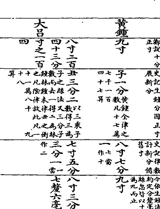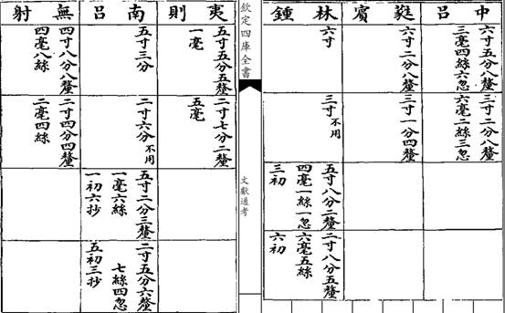 右十二律分寸釐毫絲數(今按:鄭氏與太史公說不同。太史二說又自為異,而今皆取之。且以鄭先於馬者。鄭氏之言,分寸審度之正法也。太史公之言,欲其便於損益而為假設之權制也。蓋律管之長,以九為本,上下相生,以三為法,而鄭氏所用正法,破一寸以為十分,而其下破分為釐,破釐為毫,破毫為絲,破絲為忽,皆必以十為數,則其數中損益之際,皆有馀分,雖有巧歷,終不能盡,是以自分而下,遂不可拆,而直以九相乘,歷十二管。至破一寸以為一萬九千馀分,而後略可得而記焉。然亦苦於難記而易差,終不若太史公之法為得其要而易考也。蓋其以子為一而十一三之,以至於亥,則得十七萬七千一百四十七算。而子為全律之實可知矣。以寅為子之寸數,而酉為寸法,則其律有九寸可知矣。以辰為子之分數,而未為分法,則其寸有九分可知矣。以午為子之釐數,而巳為釐法,則其分有九釐可知矣。以申為子之毫數,而卯為毫法,則其釐有九毫可知矣。以戌為子之絲數,而丑為絲法,則毫有九絲可知矣。下而為忽,亦因絲而九之。雖出權宜,而不害其得乎自然之數,以之損益,則三分之數整齊簡直,易記而不差也。其曰黃鍾八寸十分一者,亦放此意,但以正法之數,合其權法之分,故不同耳,其實則不異也。《史記》、《律數》,十誤作七者五,皆用本字而誤屈其下垂之筆,本司馬貞、沈括之說,其夾、蕤、夷三律誤字,則今以算得之。)(見書1857頁)