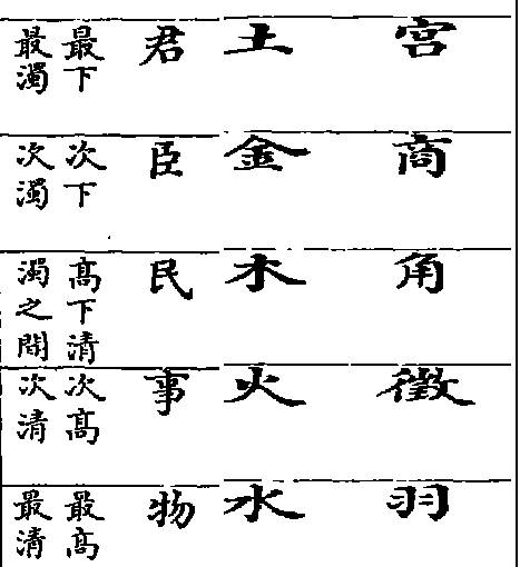 右五聲五行之象,清濁高下之次 《傳》、《樂記》:"宮為君,商為臣,角為民,徵為事,羽為物,五者不亂,則無怗懘之音矣。宮亂則荒,其君驕;商亂則陂,其臣壞;角亂則憂,其民怨;徵亂則哀,其事勤;羽亂則危,其財匱。五者皆亂,迭相陵謂之慢。如此,則國之滅亡無日矣(凡聲濁者為尊,清者為卑。怗,敝敗不和貌)。"(見書1857頁)