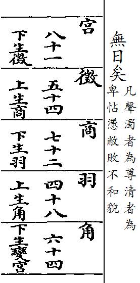 右五聲相生損益先後之次 《史記 聲數》曰:"九九八十一以為宮。三分去一,五十四以為徵。三分益一,七十二以為商。三分去一,四十八以為羽。三分益一,六十四以為角。"唐杜佑《通典》曰:"宮生徵(三分宮數八十一,分各二十七。下生去一,去二十七,馀五十四以為徵,故徵數五十四也),徵生商(三分徵數五十四,分各十八。上生者加一,加十八於五十四,得七十二以為商,故商數七十二也),商生羽(三分商數七十二,分各二十四。下生者去一,去二十四,馀四十八以為羽,故羽數四十八也),羽生角(三分羽數四十八,分各十六。上生者益一,加十六於四四十八,得六十四以為角,故角數六十四也),此五聲大小之次也。是黃鍾為均,用五聲之法,以下十一辰,辰各有五聲,其為宮商之法亦如之。故辰各有五聲,合為六十聲,是十二律之正聲也(沈括疑《史記》此說止是黃鍾一均之數,非眾律之通法。今詳《通典》云,十一辰宮商之法亦如之。蓋若以十一律為宮,亦用此數以乘之,本律之分數而損益之,林鍾為均,則以八十一為五十四,二十七為十八之類也)。