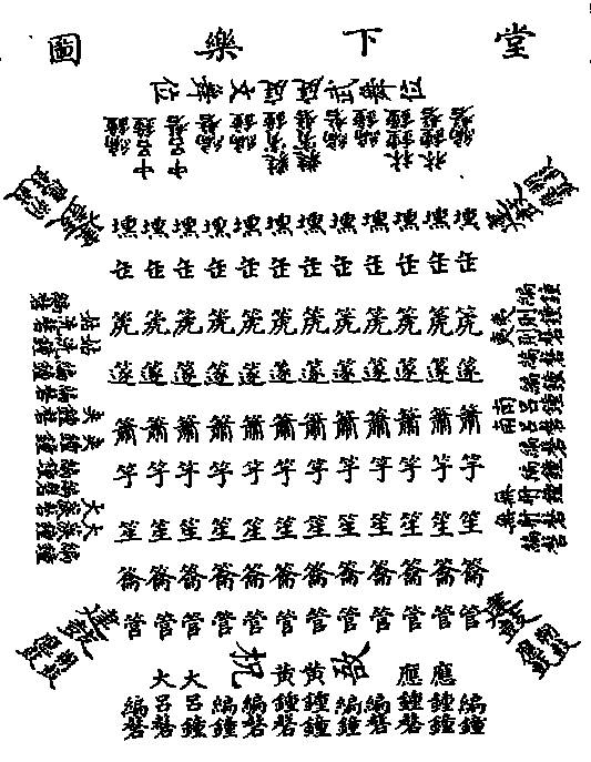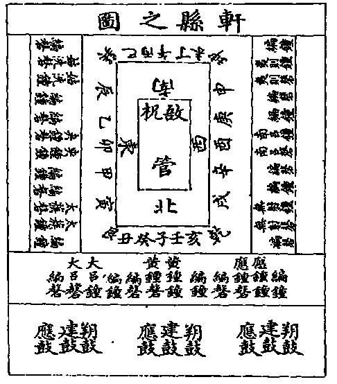 又曰:"大射之儀,樂(lè)人宿縣於阼階東,笙磬西面,其南笙鐘,其南鎛,皆南陳。建鼓在阼階西南鼓,應(yīng)鼙在其東南鼓,西階之西,頌磬東面,其南鐘,其南鎛,皆南陳。一建鼓在其南東鼓,朔鼙在其北,一建鼓在西階之東,南面,簜在建鼓之間,鼗倚頌磬西紘。蓋堂上之階,自階而左為阼,自階而右為西,笙磬在阼階之東而面西,頌磬在西階之西而面東,由笙磬而南,鐘鎛所以應(yīng)笙者也。由頌磬而南,鐘鎛所以應(yīng)歌者也。階雖分乎東西,其鐘鎛南陳一也。自阼階堂下言之,一建鼓在其西而面南,鼙在其東而亦面南焉。自西階堂下言之,一建鼓在其階之南而面東,朔鼙在其北而亦面東焉。一建鼓在其階之東,面南,簜在建鼓之間,鼗倚於頌磬之西紘,蓋諸侯之樂(lè),備三面以為軒縣。大射之儀,東西有鐘磬之縣推之,則天子宮縣,堂上之階,笙磬頌磬各十二縣。堂下阼階而南,特鐘特鎛亦各十二縣。西階而南,編鐘、編鎛亦各十二縣,天數(shù)也(《魏志》曰:"武帝至漢中,得杜夔說(shuō)舊法,始復(fù)軒縣磬。"如今用之,受之於杜夔也)。"